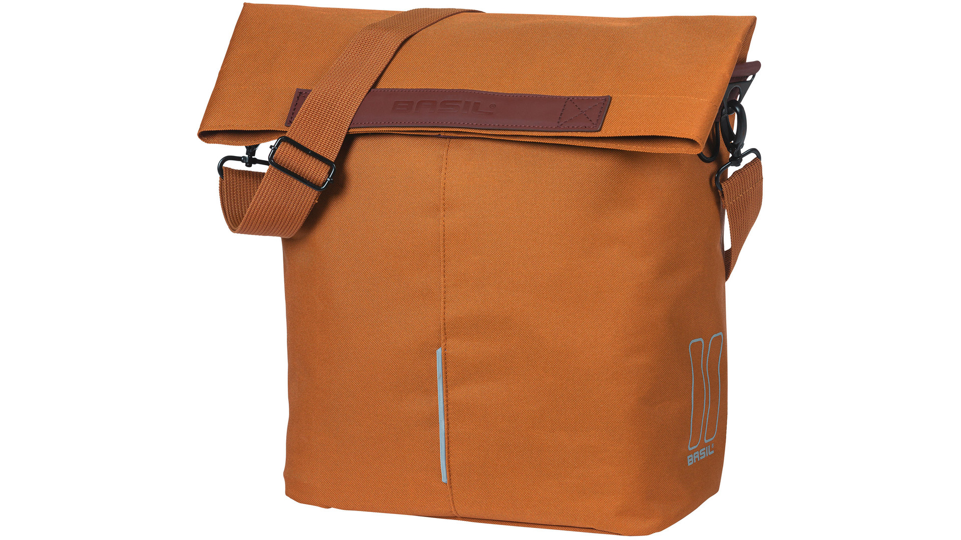 Polyester, vouwsluiting met magneet, binnenvak met ritssluiting, hengsel met vegan lederen details, afneembare schouderriem, bevestigingsmogelijkheid voor LED verlichting, reflecterende applicaties